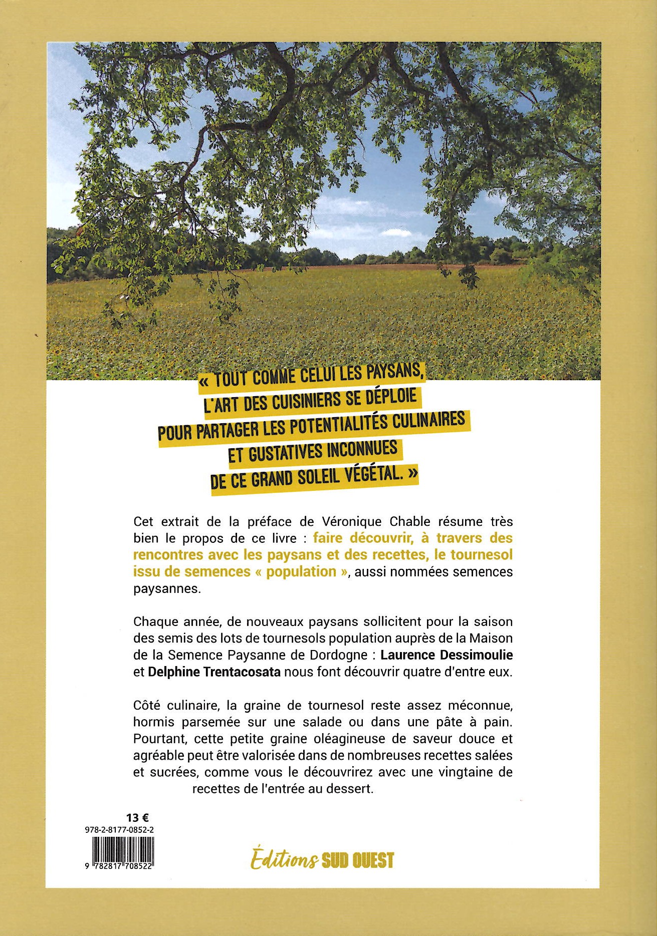 Cet extrait de la préface de Véronique Chable résume très bien le propos de ce livre : faire découvrir à travers des rencontres avec les paysans et des recettes, le tournesol issu de semences "population", aussi nommées semences paysannes.