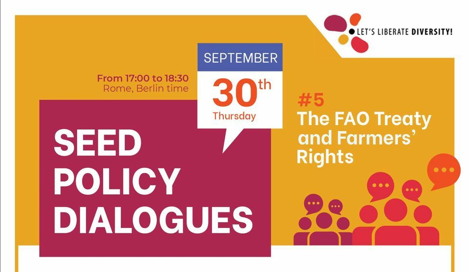 La coalition européenne Let's Liberate Diversity (LLD), dont le RSP fait partie, est heureuse de vous inviter à la 5ème édition des Seeds Policy Dialogue, le 30 septembre 2021 de 17 à 18h30 qui aura pour thème " Le Traité international sur les ressources phytogénétiques pour l'alimentation et l'agriculture (TIRPAA) et les droits des paysans".